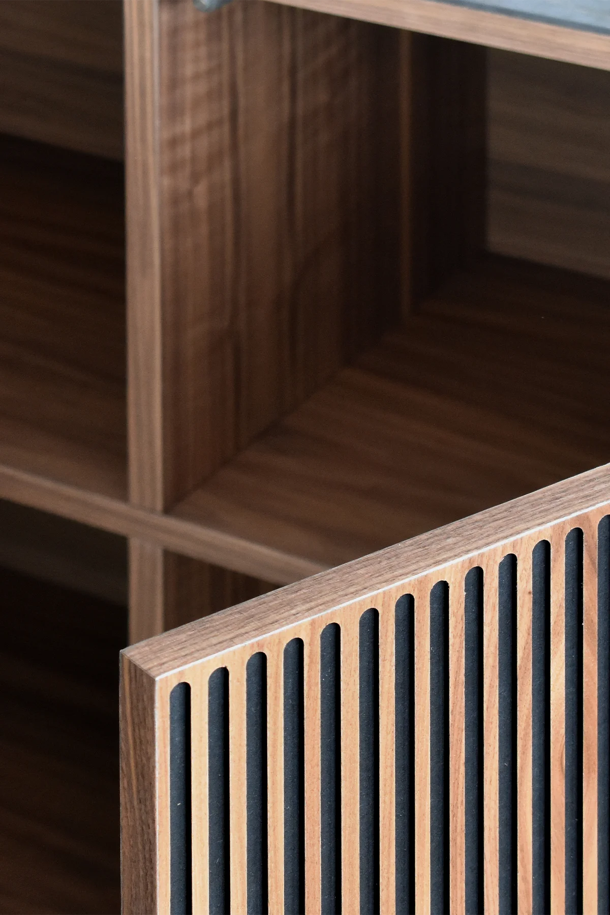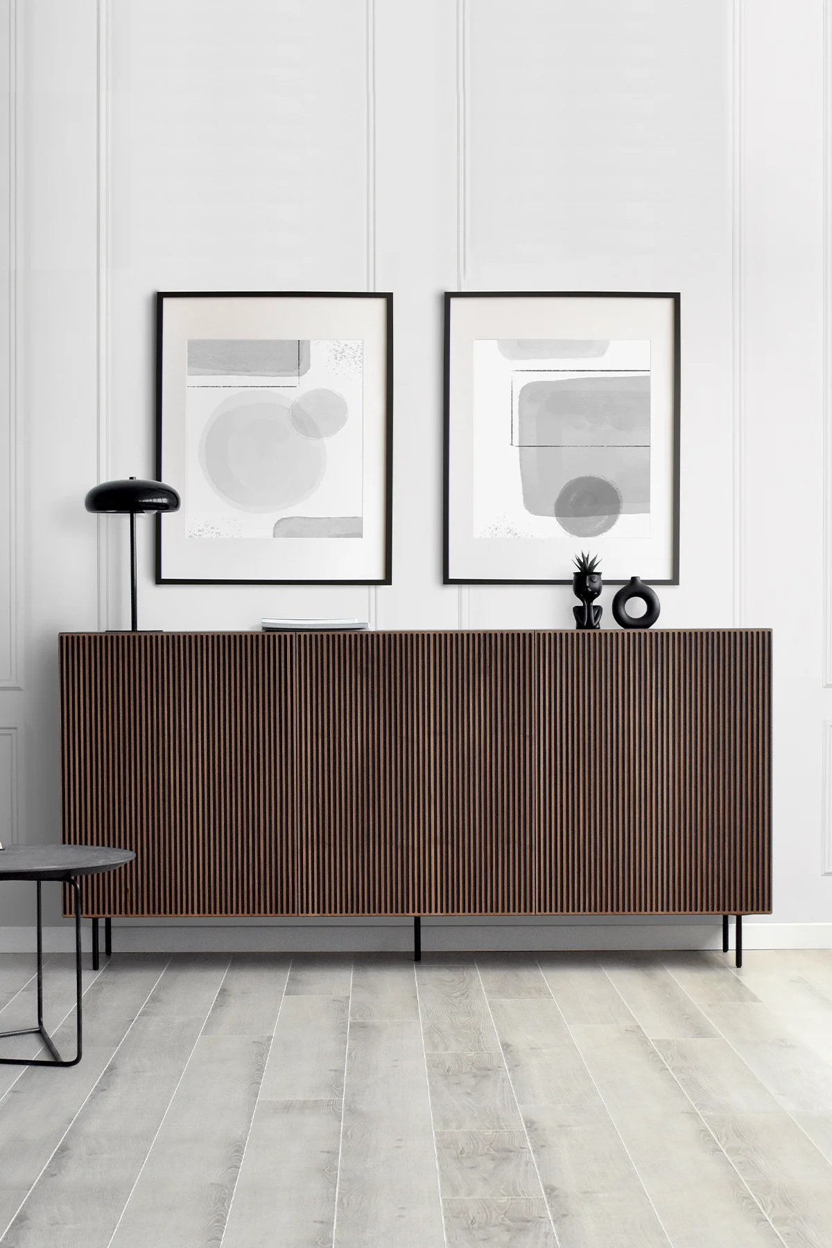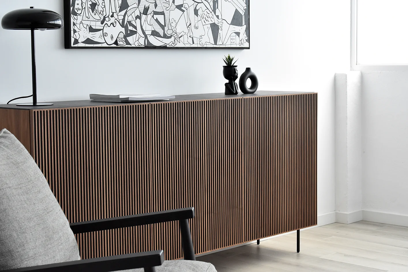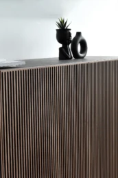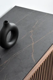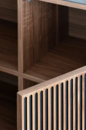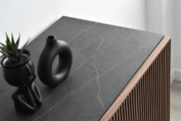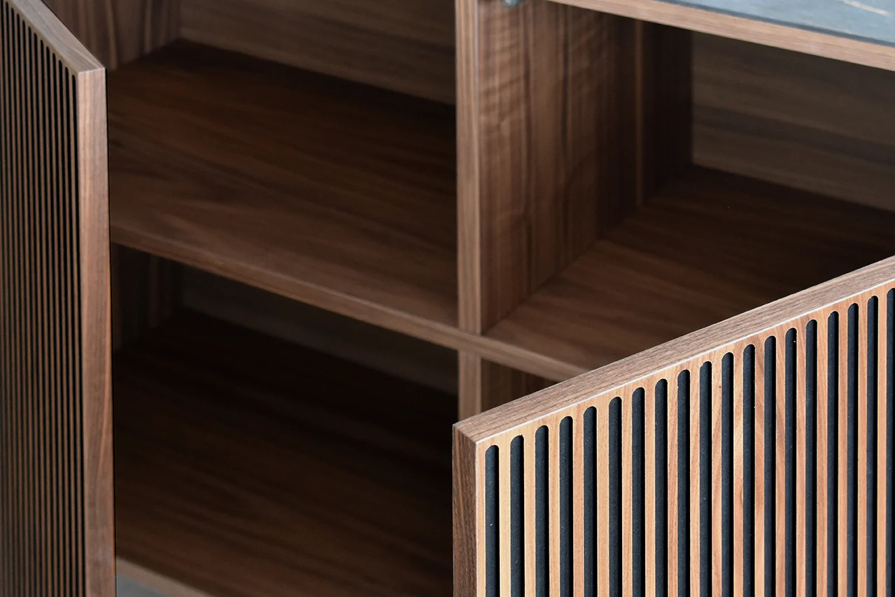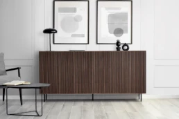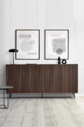 This Nordic-inspired collection combines straight lines with the natural beauty of oak wood, creating an elegant and harmonious corner in your living room. Every detail reflects the elegance and simplicity of Scandinavian design, contrasting the colors of the black material with the natural walnut. Available in oak, walnut, lacquered finishes and with all our leg models. Option in porcelain top.