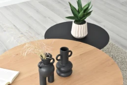 The organic shapes of our Geo model directly evoke nature, the basics, the essential, creating a warm and attractive atmosphere. The fusion of wood and metal in the right balance and naturalness, bring a timeless aura to the design. It follows in the wake of our Nordic designs by adopting metal as another material within nature. *Available in porcelain & Wood top.