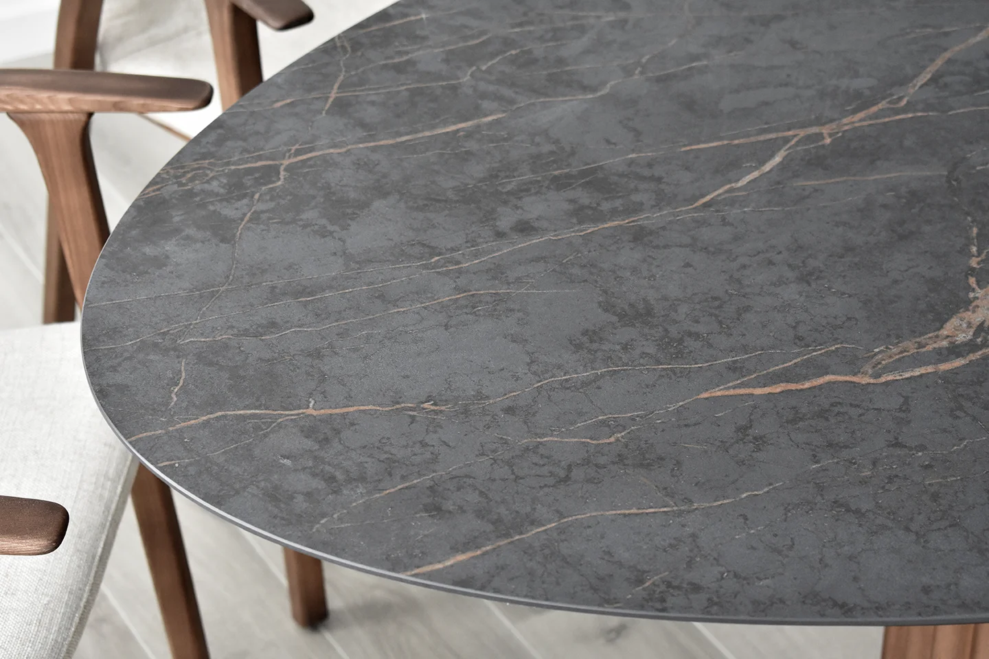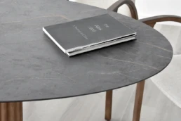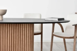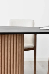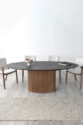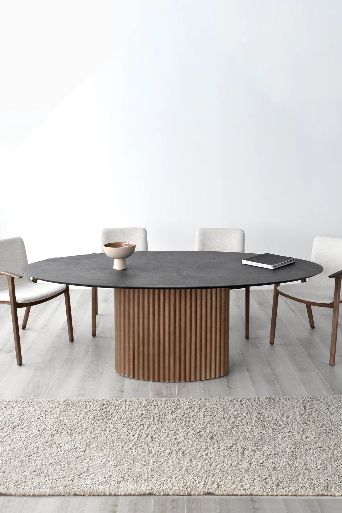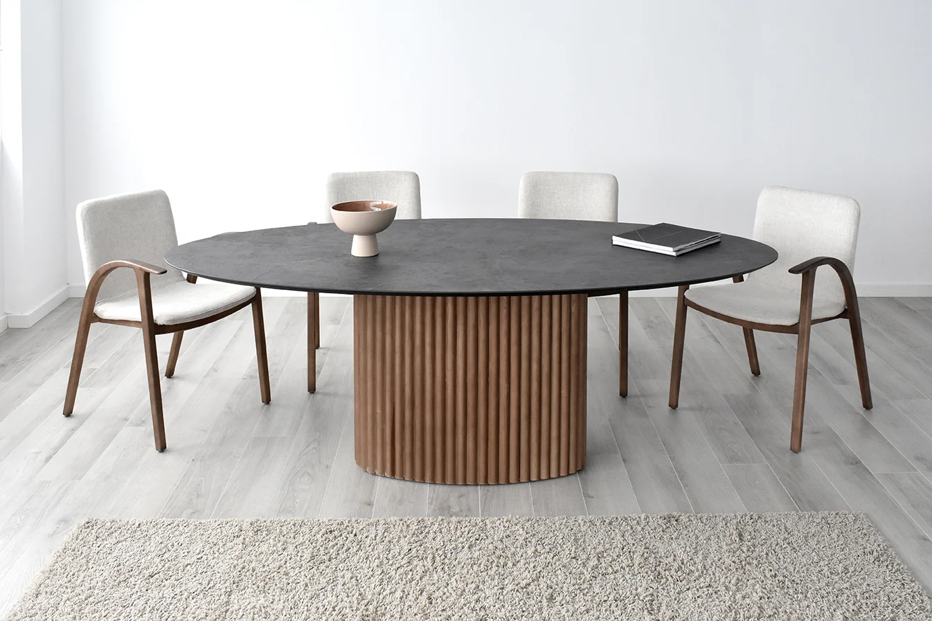 At Kanem we have always been committed to the closeness warmth of oval tables and Aurë is faithful to the principles, in which organic materials and shapes take centre stage. The solid wood slatted base creates a light and warm space that brings originality and character to the home. Available in Stone Top (porcelain).