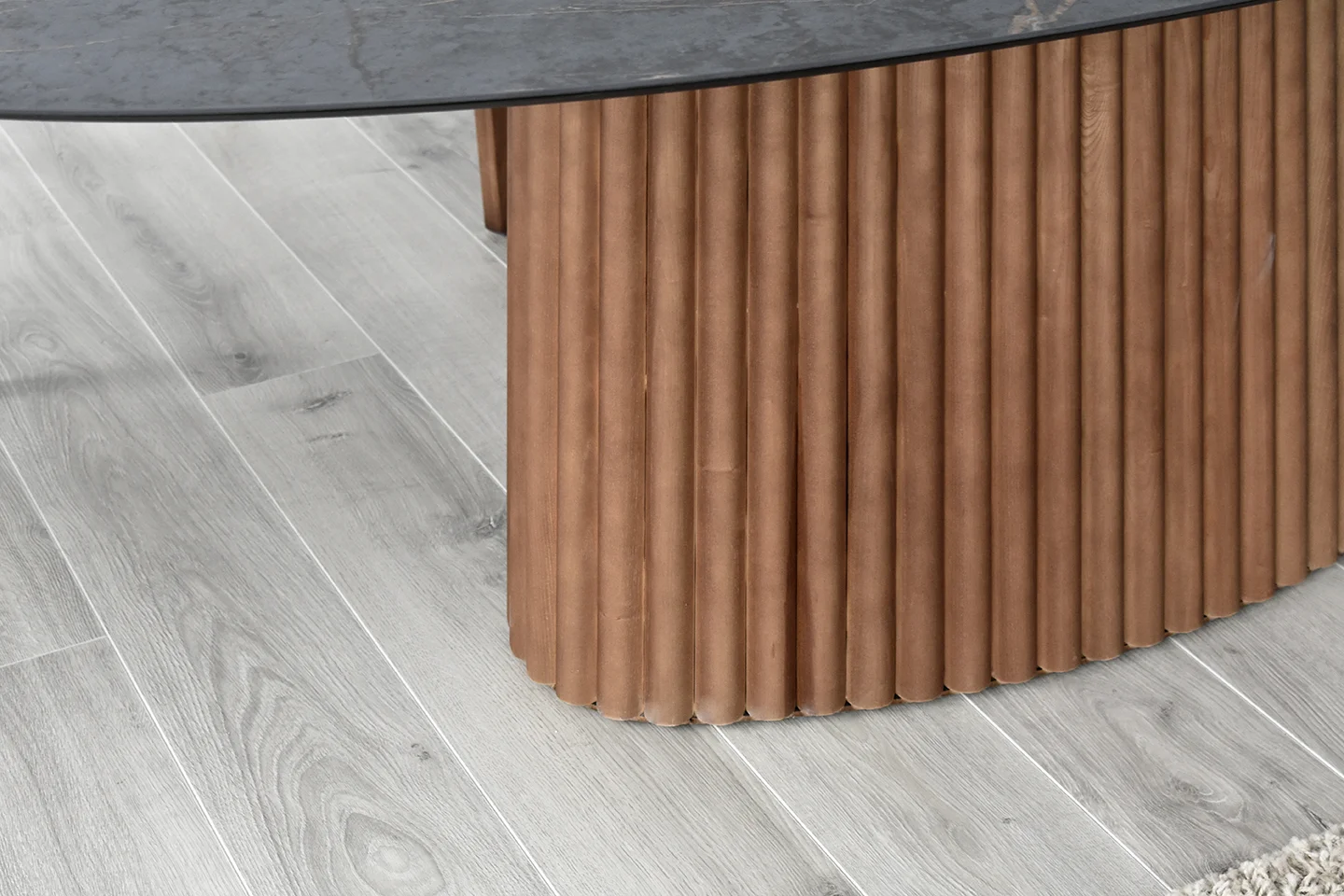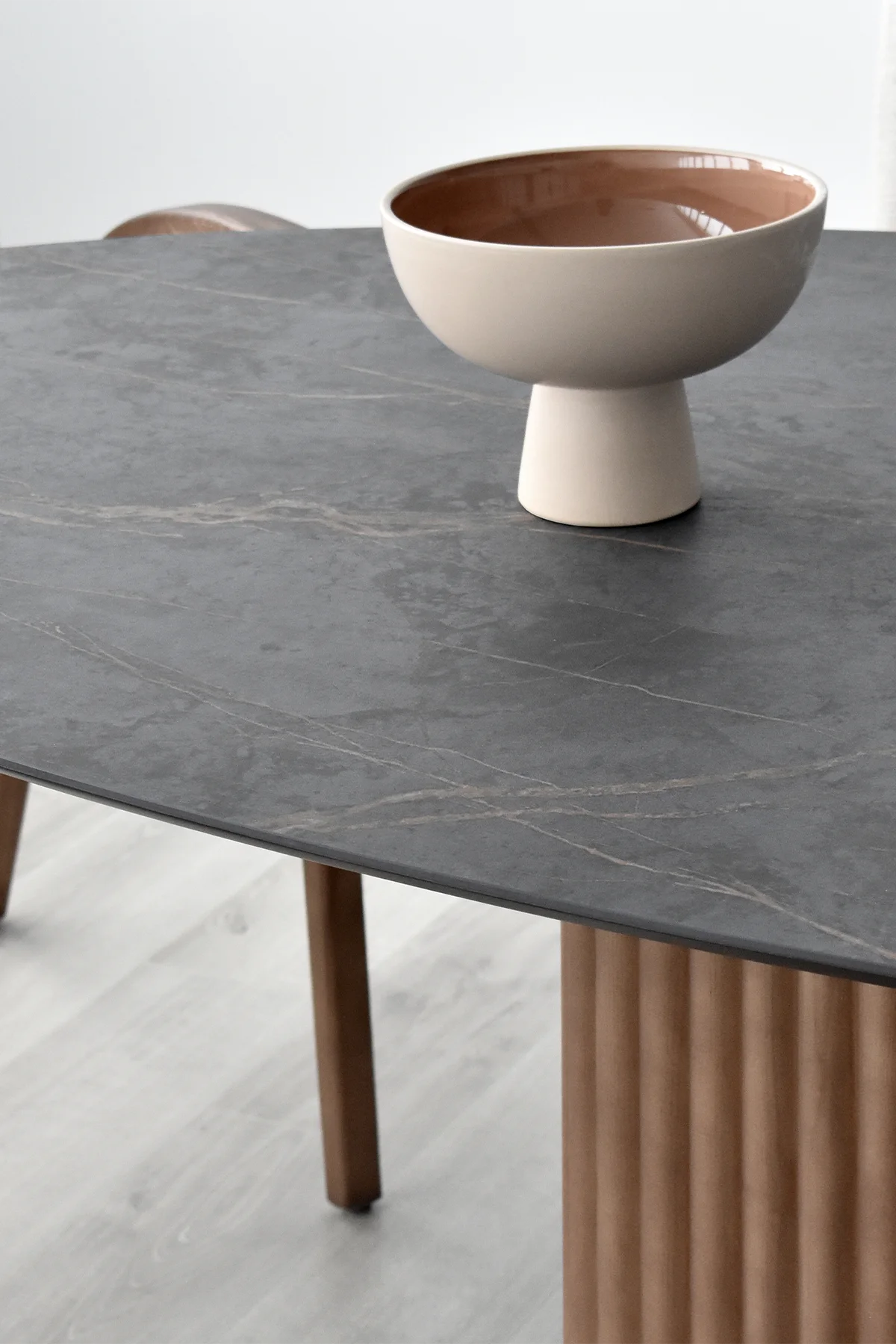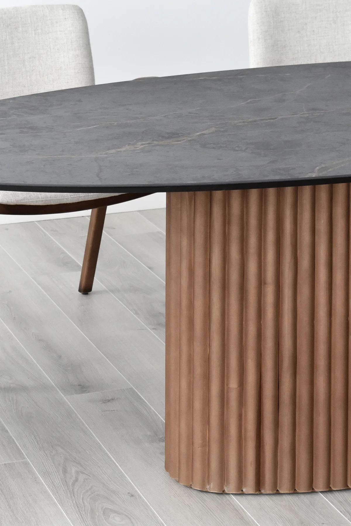 At Kanem we have always been committed to the closeness warmth of oval tables and Aurë is faithful to the principles, in which organic materials and shapes take centre stage. The solid wood slatted base creates a light and warm space that brings originality and character to the home. Available in Stone Top (porcelain).