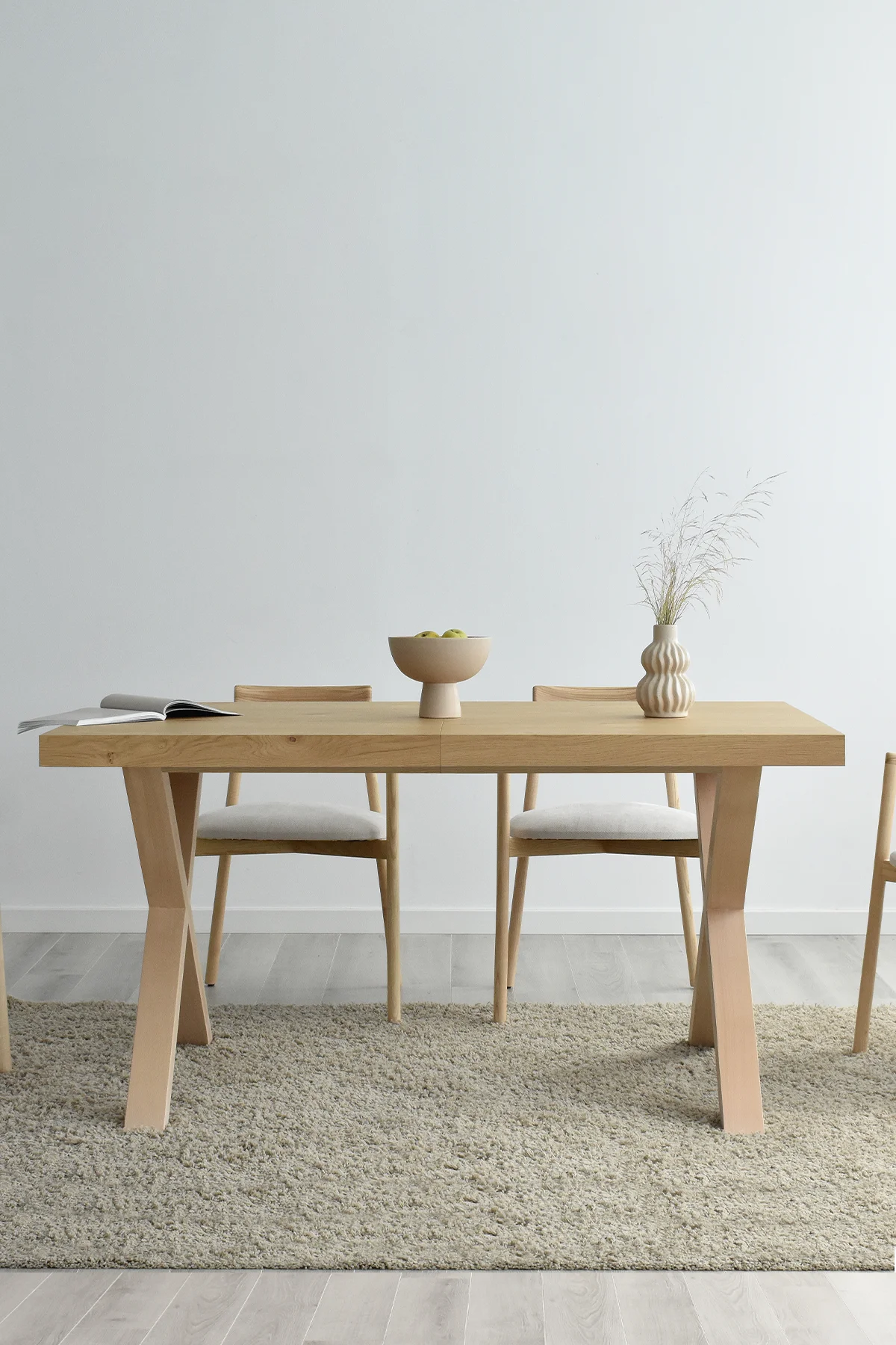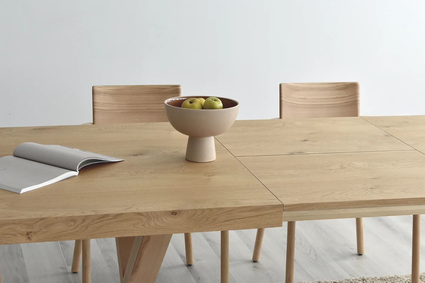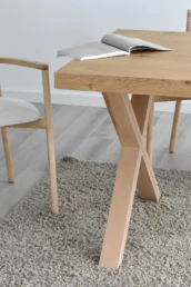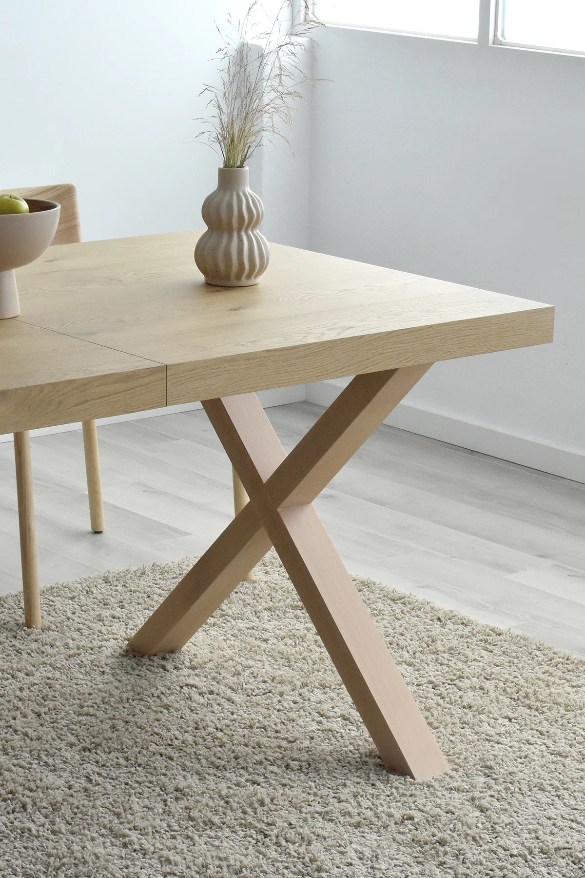 This design combines classic Nordic shapes, natural wood and great functionality. Elegant mix of symmetries and colors give your home warmth and avant-garde with an original design of crossed legs that breaks the monotony of the most classic design. Finishes in different oak, walnut and lacquered.
