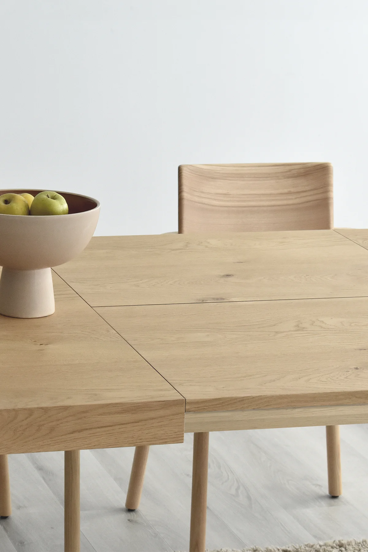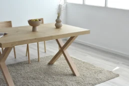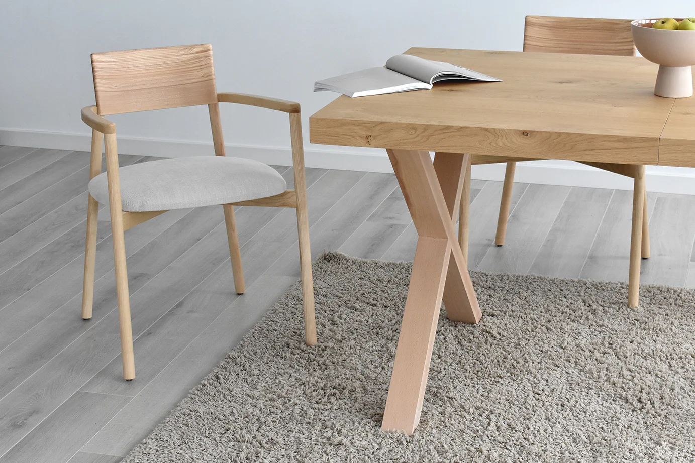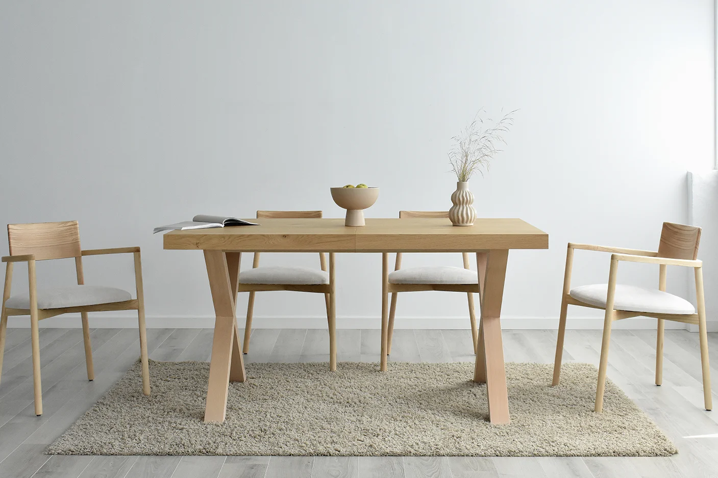 This design combines classic Nordic shapes, natural wood and great functionality. Elegant mix of symmetries and colors give your home warmth and avant-garde with an original design of crossed legs that breaks the monotony of the most classic design. Finishes in different oak, walnut and lacquered.