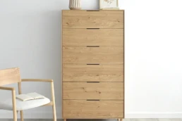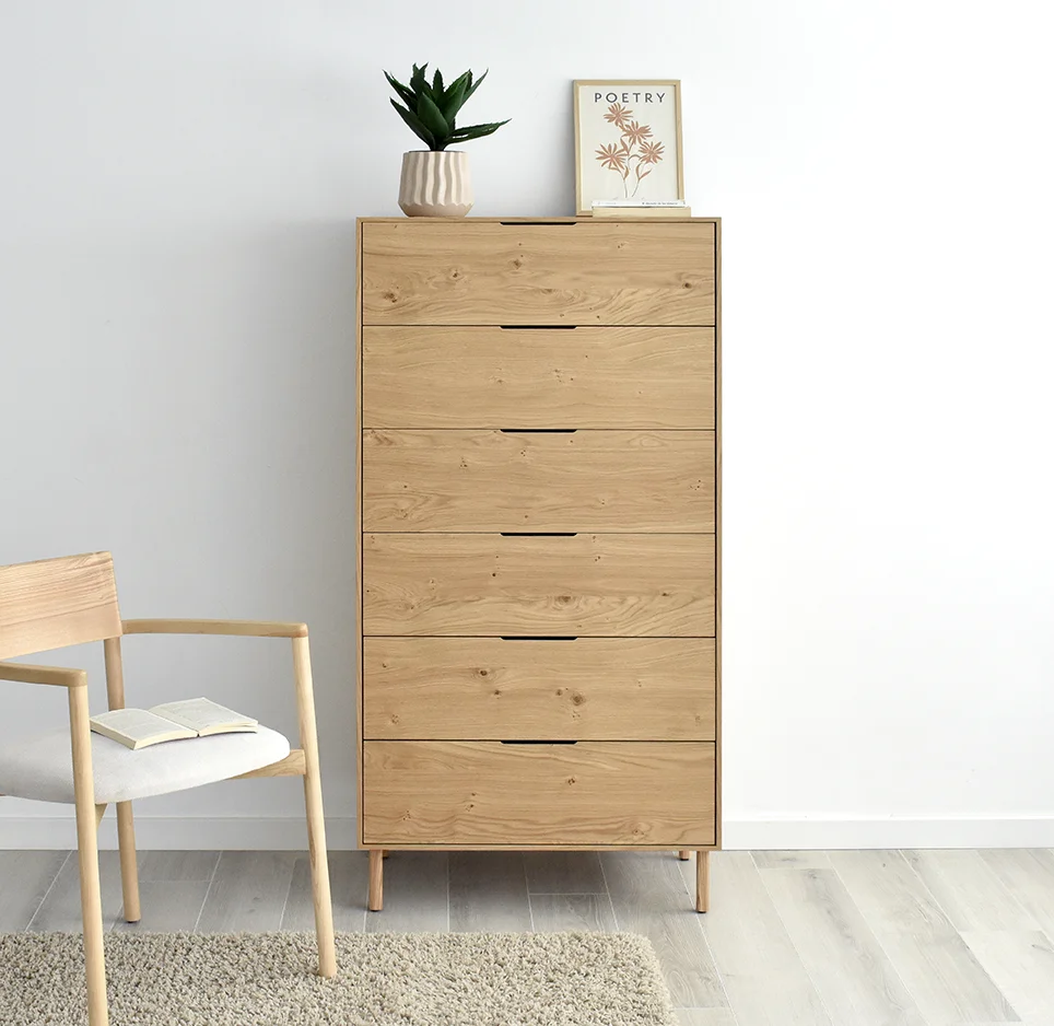 In Colonia we sense Nordic and simple shapes combing the naturalness of wood with the most avant-grade and practical design. Thin, soft profiles, fronts in an interior layout and beds without exposed legs to give the composition greater lightness. Collection composed of bedside tables, low & high chest of drawers, headboard and bed base. All leg models available.